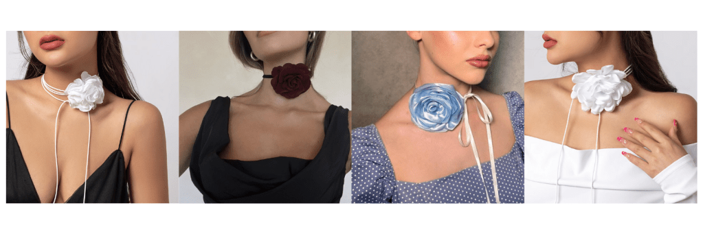 La fusión de dos tendencias principales, los choker (collares pegados al cuello) y las flores de gran tamaño, ha dado lugar a una combinación única y fascinante. Las flores tridimensionales, que anteriormente adornaban prendas de ropa, han encontrado un nuevo hogar en el cuello de las fashionistas más arriesgadas.