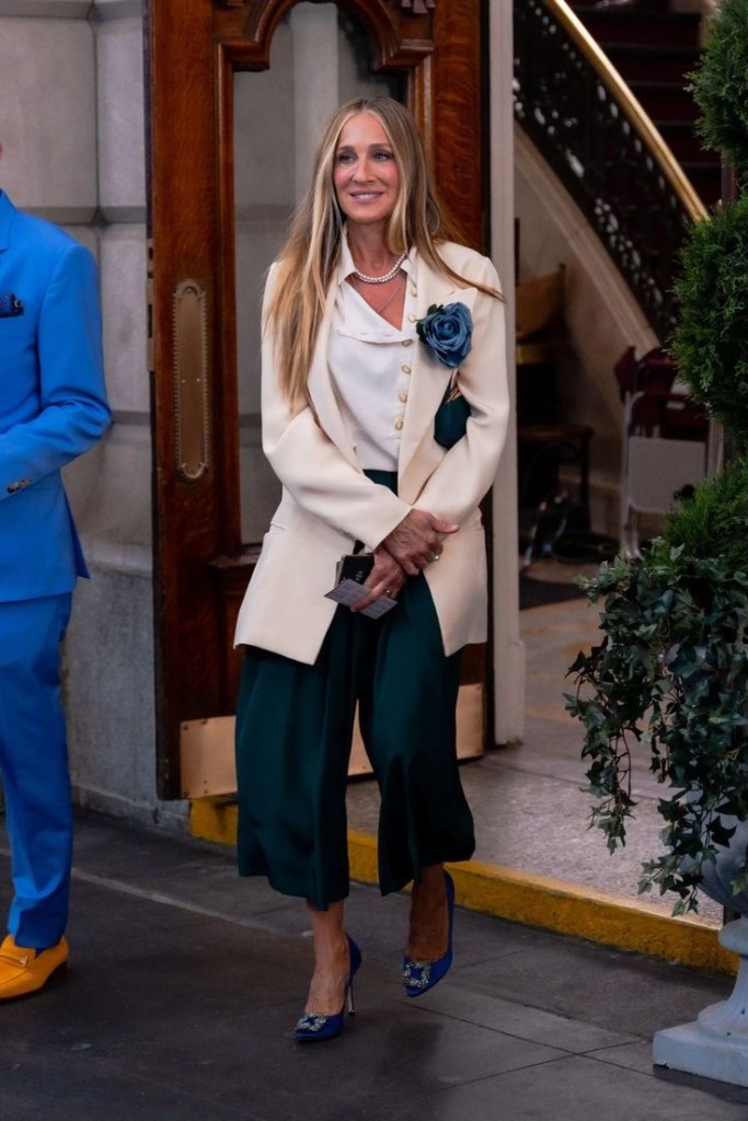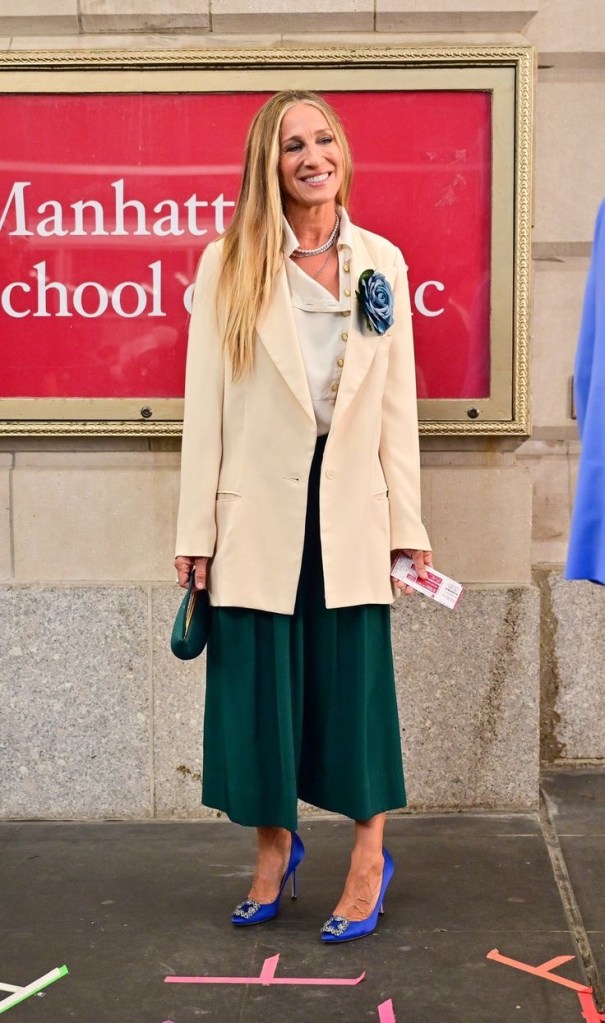 Carrie Bradshaw demostró una fascinación desmedida por los zapatos a lo largo de la serie, y ninguno es más emblemático que el Manolo Blahnik Hangisi Blue. Estos zapatos, con su característico broche de diamantes en la punta y su inolvidable tono azul, alcanzaron notoriedad gracias a la escena en la que Mr. Big le propone matrimonio a Carrie en la película «Sexo en Nueva York: La Película». A partir de ese momento, estos zapatos se convirtieron en un símbolo de romance y moda desenfadada.