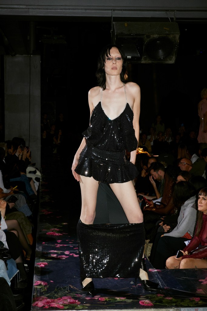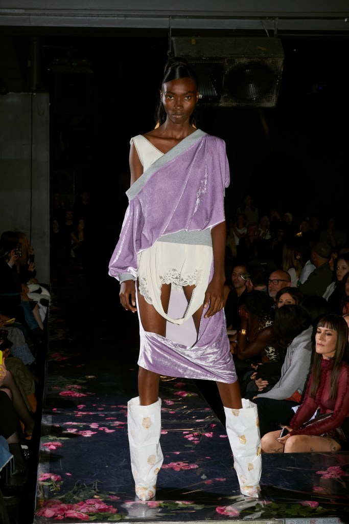 Los colores pasteles, blanco, negro y brillo predominan en los diseños. También tienen presencia las botas de tacón arrugadas de colores plateado, negro y rojo.