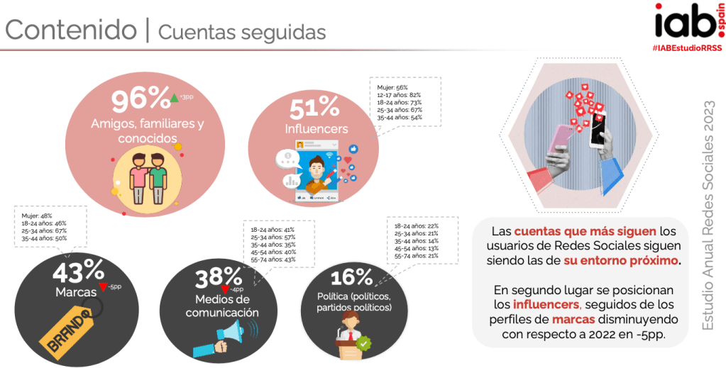 Las cuentas que más siguen los usuarios de redes sociales siguen siendo las de su entorno próximo. En segundo lugar se posicionan los influencers, seguidos de los perfiles de marcas.