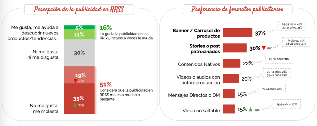 Uno de cada dos usuarios no les gusta la publicidad en redes sociales y les resulta molesta. Por otro lado se reduce (teniendo en cuenta los datos de 2022) el número de usuarios a los que les gusta ver publicidad según sus intereses y aumentan los detractores. El 40% afirma que la publicidad que ha visto en RRSS cumplía sus expectativas.