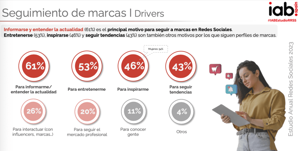 Según el estudio de IAB sobre redes sociales, el informarse y entender la actualidad es el principal motivo para seguir a marcas en redes sociales (61%), seguido por entretenerse (53%), inspirarse (46%) y seguir tendencia (43%).