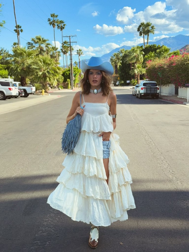 Lucía apostó por una estética boho-western en tonos blancos con un vestido fluido de volantes y escote delicado, que aporta movimiento y frescura al look. Lo combinó con un sombrero cowboy en azul suave y un bolso de flecos a juego, elevando el conjunto con un aire desenfadado pero muy cuidado. Las botas bicolor estilo western y las joyas plateadas con piedra central añaden carácter y un guiño vintage perfecto para el entorno desértico.