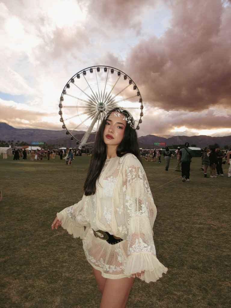 La influencer apostó por un look romántico en tonos marfil con un vestido fluido de encaje y mangas amplias, creando una estética etérea y delicada. El cinturón ancho en contraste define la silueta y aporta un toque western al conjunto, mientras la diadema floral eleva el estilismo con un aire boho y soñador. Su melena suelta y maquillaje natural refuerzan la suavidad del look, que se potencia con el atardecer y la noria al fondo, envolviendo la escena en una atmósfera mágica y festivalera.