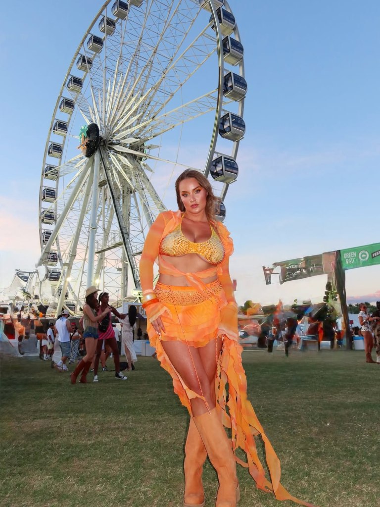 Sandra Perez apuesta por un look festivalero en tonos naranja vibrante, con un conjunto de top y falda de inspiración boho adornado con pedrería y volantes que aporta movimiento y brillo bajo la luz. La sobrecamisa ligera y translúcida suma dinamismo y refuerza el aire etéreo del estilismo. Las botas altas en tono a juego elevan el outfit con un guiño western, mientras los accesorios y el maquillaje luminoso completan un conjunto llamativo, perfecto para un ambiente festivo al atardecer.