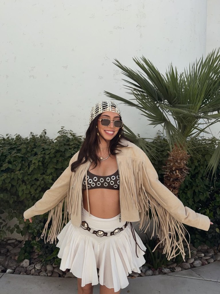 Tara Michelle por un look boho con toques western, combinando una chaqueta de ante con flecos que aporta movimiento y personalidad. La llevó sobre un top tipo bandeau con detalles metálicos y una falda blanca de vuelo que equilibra el conjunto con un aire fresco y femenino. El cinturón con aplicaciones, el pañuelo de crochet en la cabeza y las gafas de sol completan un estilismo relajado pero muy cuidado, perfecto para el ambiente festivalero.